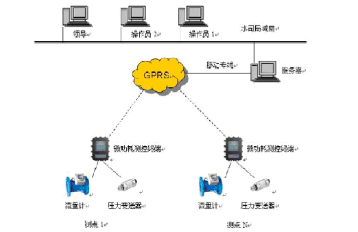 自來水廠調度中心、各職能部門之間數據通信在局域網內完成;管網測點與自來水廠調度中心之間采用GPRS無線通信。